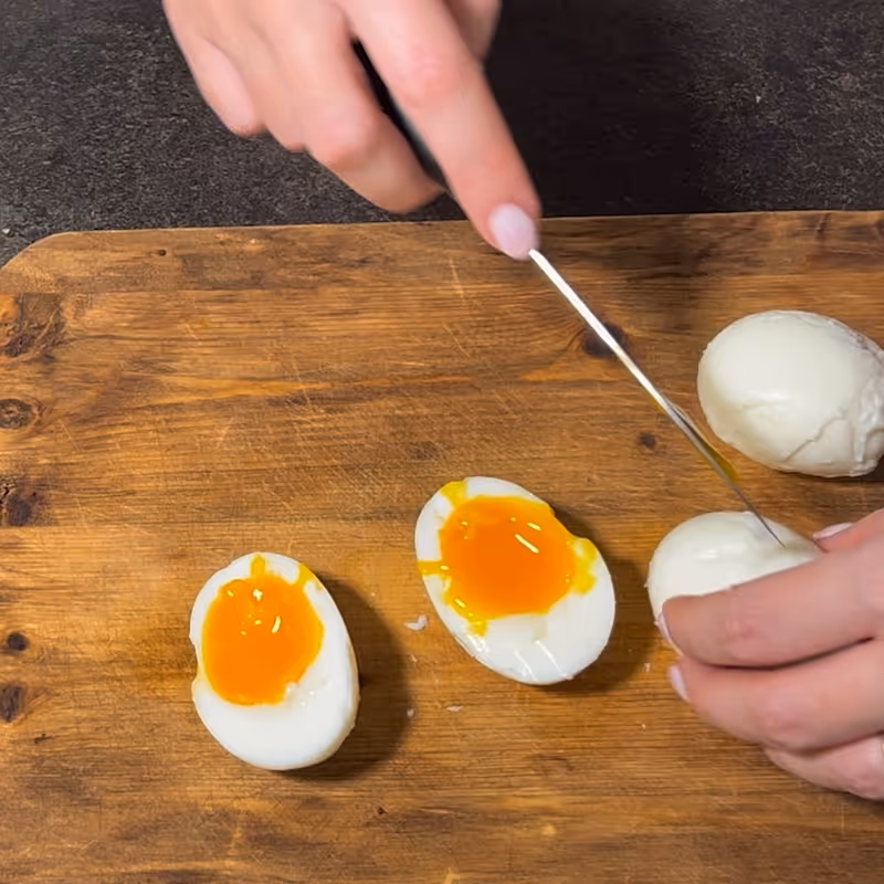 - Prepare the eggs: Boil the eggs for 6 minutes to achieve a firm white and slightly creamy yolk.