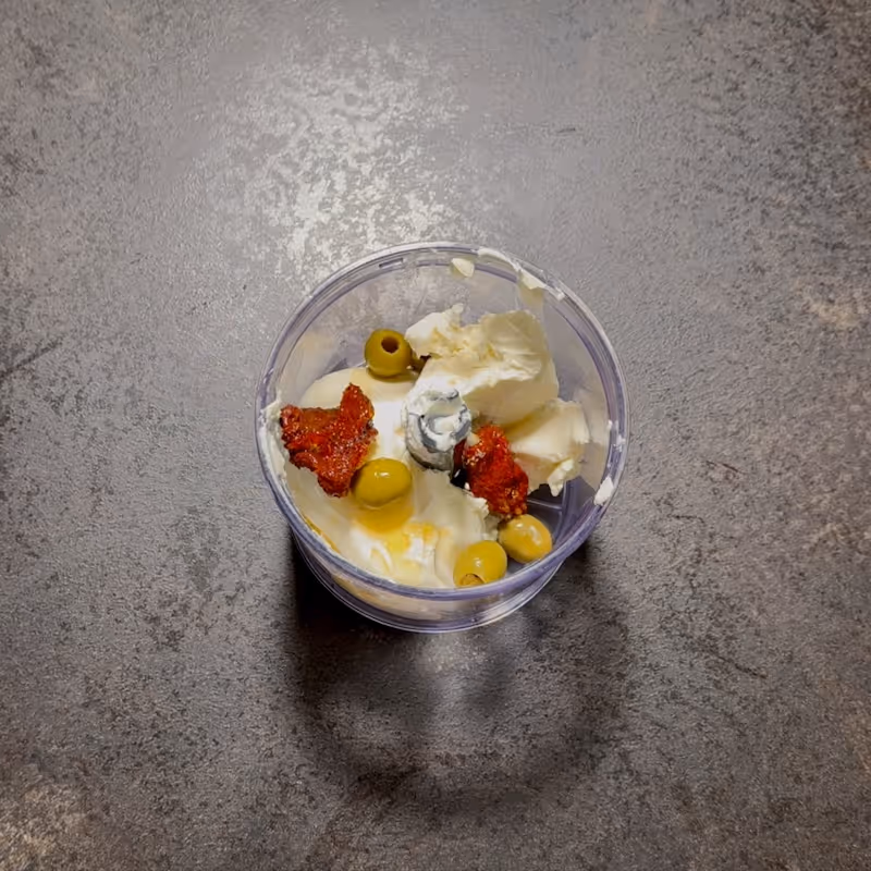 - Make the cheese spread: While the eggplant drains, prepare a creamy spread. In a food processor, add cream cheese, green olives, sun-dried tomatoes in oil, and oil from the tomatoes.