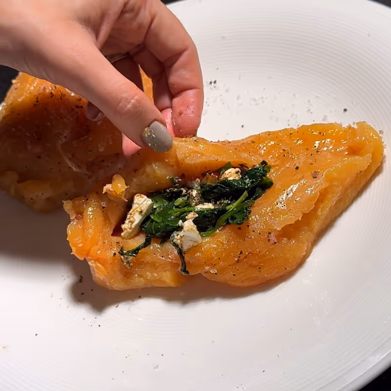 - Season the chicken breasts with salt and pepper, then cut a pocket into each.