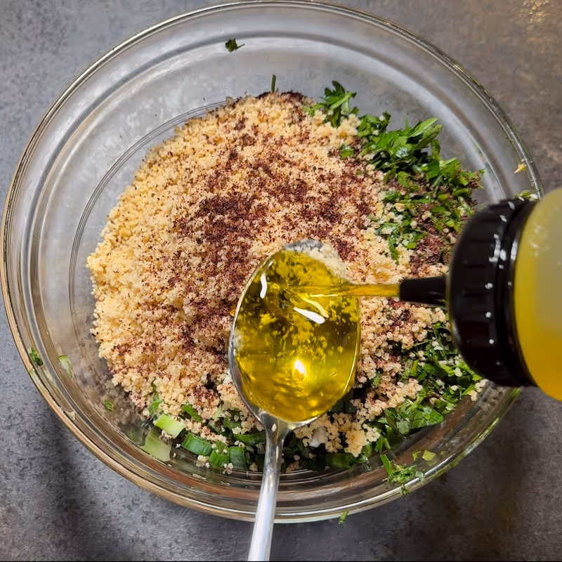 Olive oil gives body and carries flavor through the couscous. Using couscous makes this a tabbouleh salad with couscous that's wonderfully tender and quick—ideal when you want the same refreshing vibe in less time than it takes to cook bulgur.