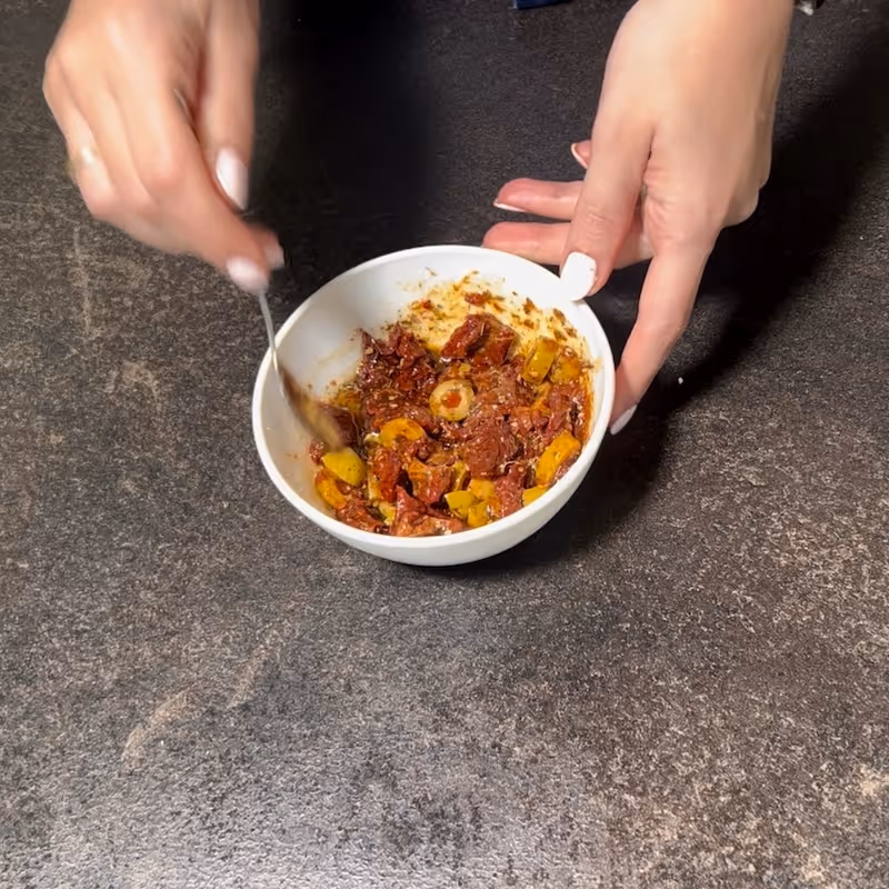 - Mix the aromatic oil: Next, combine the chopped sun-dried tomatoes, sliced olives, za'atar, and olive oil.