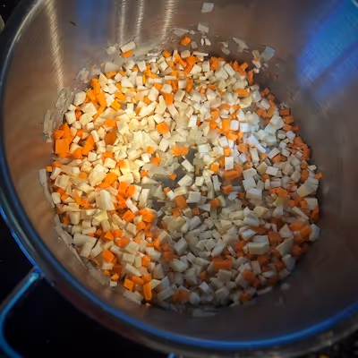 - Peel, wash and dice the onion, leek, carrots, parsley root, parsnip, celery, and bell pepper. In large pot, sauté these veggies in a tablespoon of butter over medium heat for about 4-5 minutes.